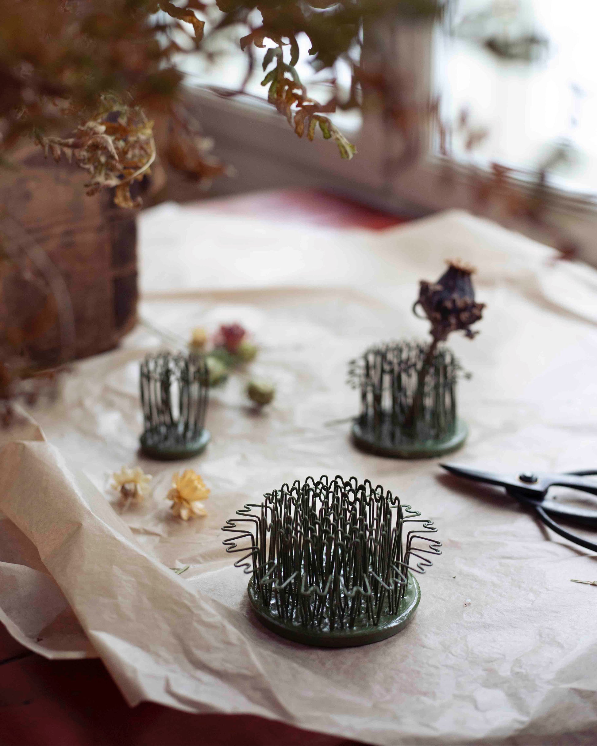 Ruostumattoman kukkasiilin pohja on valmistettu lyijystä ja "hiuspinnit" ovat messinkiä. Pinnit ovat hieman joustavia, joka helpottaa paksujen varsien asettelua. Hairpin Holderia voi käyttää yhä uudelleen ja uudelleen ja se säilyy hyvänä vuosikymmeniä. Maalipinta voi kuitenkin lohkeilla ajan saatossa. Se on hyvä korvaaja kukkasienelle, joka sisältää mikromuovia sekä myrkyllisiä ainesosia.
